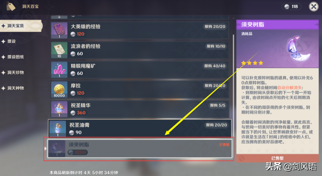 常规奖励:洞天货宝。每个星期刷新一次,【须臾树脂】必买,其他有经验书、摩拉、精炼用魔矿、圣遗物经验素材,看个人需求购买。