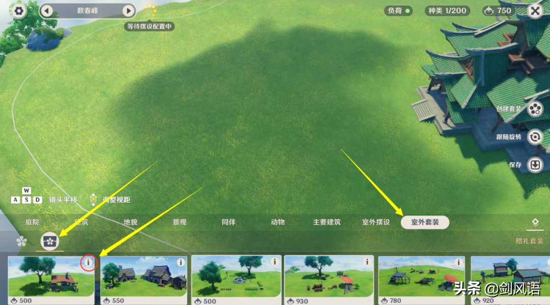 2.打开摆设界面【PC按F7】,如下图,在摆设界面点击最右边室外套装,在室内就点击室内套装,点击图片上的感叹号,即可看到摆设套装需要的道具和偏好的角色,摆设道具没有就去制造,偏好角色则需要自己拥有。