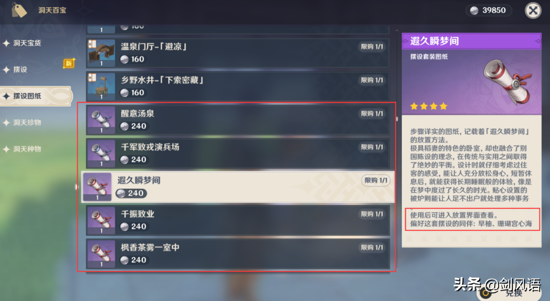 1.先到尘歌壶找阿圆对话,在摆设图纸选项处购买【摆设套装图纸】,然后打开背包使用该图纸。