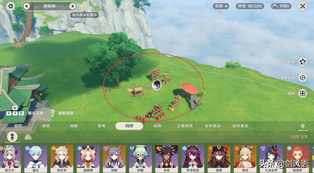 3.如果摆设道具齐全,点击套装图片,即可把摆设套装摆放出来,然后在同伴选项处,把偏好的角色放到摆设套装周围。接着保存,退出摆设界面。