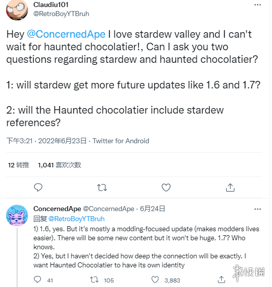 《星露谷物语》由ConcernedApe单人开发,最早在2016年发售,这款游戏仍然是目前为止最好玩的种田游戏之一,前段时间更是突破了2000W销量,但由于开发者已经投入到下一款游戏《闹鬼巧克力工房》中去,有玩家担心《星露谷物语》没有更多的更新内容了。一位粉丝向ConcernedApe询问后,他透露《星露谷物语》即将推出1.6版本。