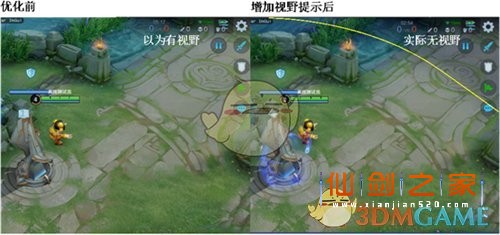 首先如下图所示,左边的图是开启前,右边的图是开启后。其实视野范围提示,就是精准显示视野范围,因为英雄的真实视野是圆形范围,开启后只是在【无法看到的区域增加了美术表现】,以此将真实的视野范围展现出来而已。