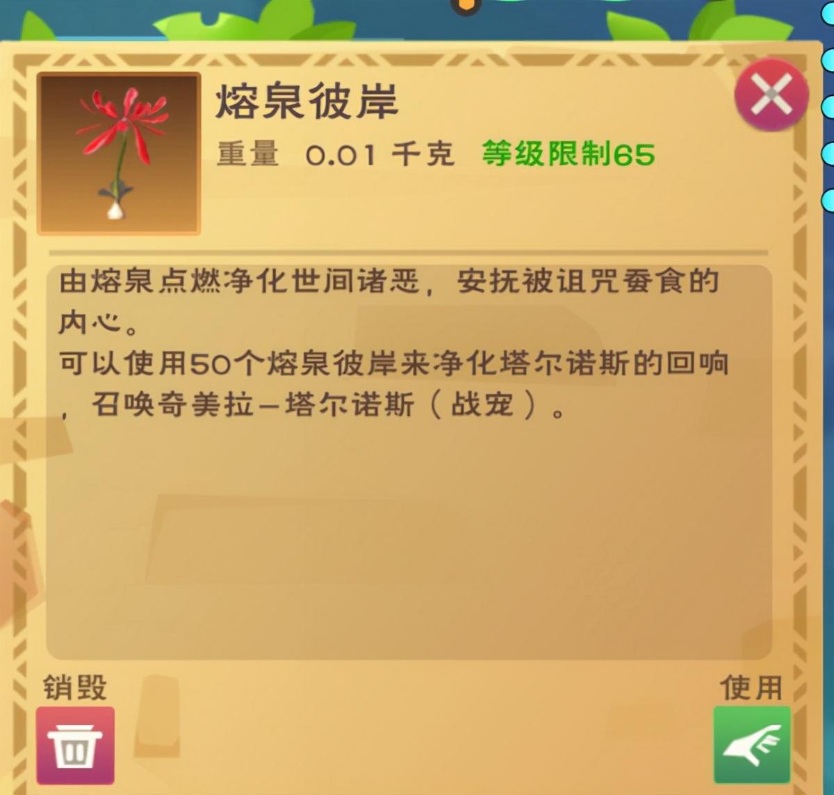 3、然后使用熔泉之心采摘彼岸花,获取融泉彼岸。