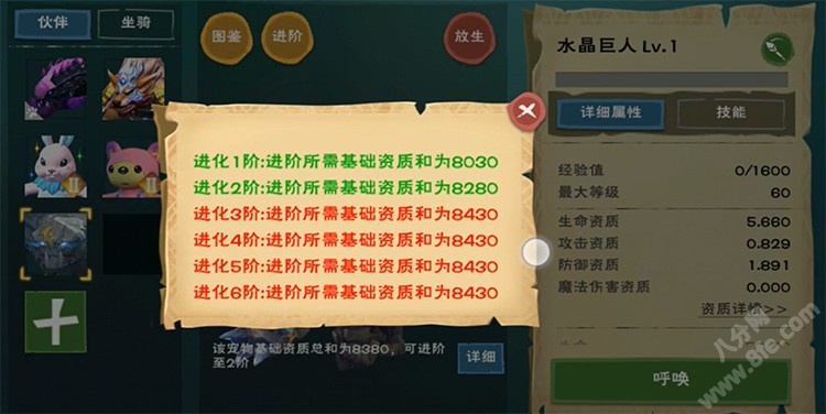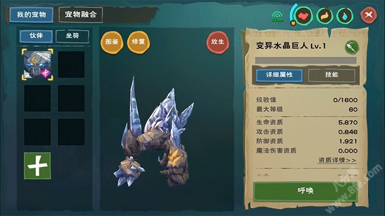 在《创造与魔法》中水晶巨人是辅助型战宠,拥有较高的血防,擅长嘲讽拉仇恨,在PVE中的实用价值极高。水晶巨人需要宠物融合获得,其过程分为五个阶段,依次为绿巨人、棕巨人、粉巨人、红巨人、水晶巨人。许多玩家不知道水晶巨人怎么合成方法,下面八分网带来创造与魔法水晶巨人融合方法、进阶资质、进阶技能介绍,需要的玩家可以参考一下!