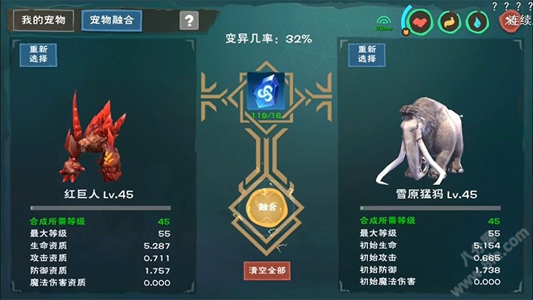 融合方法:45级红巨人+45级雪原猛犸+16个融合石