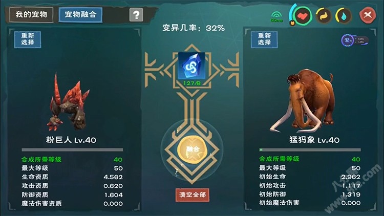 融合方法:40级粉巨人+40级猛犸象+8个融合石