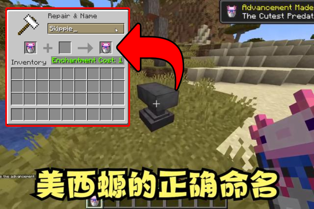 但对于部分特殊的生物,我们还是可以选择另外一种方法——使用铁砧改名。该方法适用于美西螈,只要将美西螈桶放置在铁砧改名,往后倒出的美西螈便会自带名字,再也不怕被清除掉,在生存前期这将是非常有用的mc小技巧!