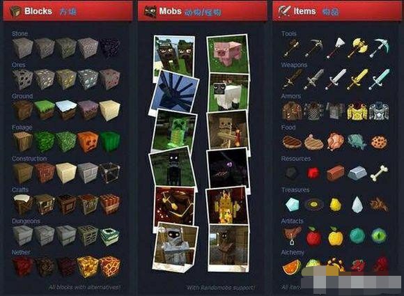————————————==作者的介绍==既然是方块,那就展现方块的风格.既然是方块,那就贯彻方块的概念.其中要特别说明的地方就是鹅卵石,石砖和裂缝石砖三种方块的纹理把它们放一起纹理是紧密相连的。就是自然吻合的,而不是断开的纹理.也就是说这几种方块搭配在一起更能表现出那种自然,随机性非常强的视觉效果,而不是那种机械性肌理纹。————————————