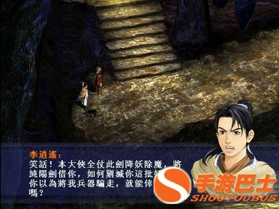 这里借剑的方法是在对话结束之后按ESC选择物品装备,把木剑带上卸下纯阳剑,对准土妖使用纯阳剑就可以借给它了。来到迷宫尽头会看到boss一样的怪,这个时候可以按ESC储存进度,这里注意只要不是在战斗情况下都是可以储存进度的。这个时候我们要击败罗刹鬼婆,但是他十分强大,在游戏设定中这场战役是必败的,随后我们就进入李大娘的房子内开启主线剧情了。