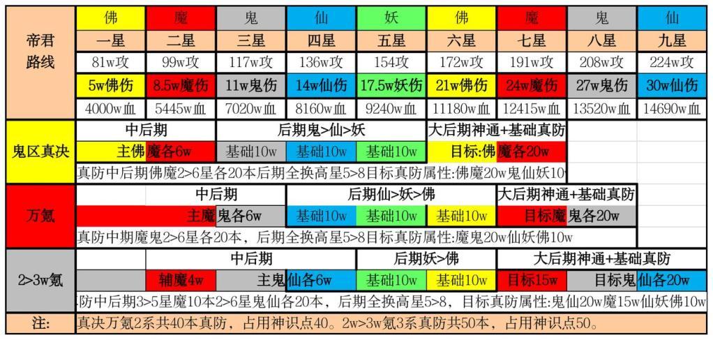目前新区的(鬼区多),该路线是最符合游戏环境的主流路线,相比极限真伤pvp,极限真防帝君,均衡的路线能同时满足试炼与神界界主的要求,并且能保证最快的攻防进度。借用宿水大佬表格。
