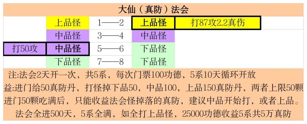 建议属性够法会5系全进,2天一次,一次100功德,1系10天一循环,平均每天消耗50功德,共消耗2.5w功德500天毕业:打中品获得5系共37500,如果打上品则5系共收益50000真防。