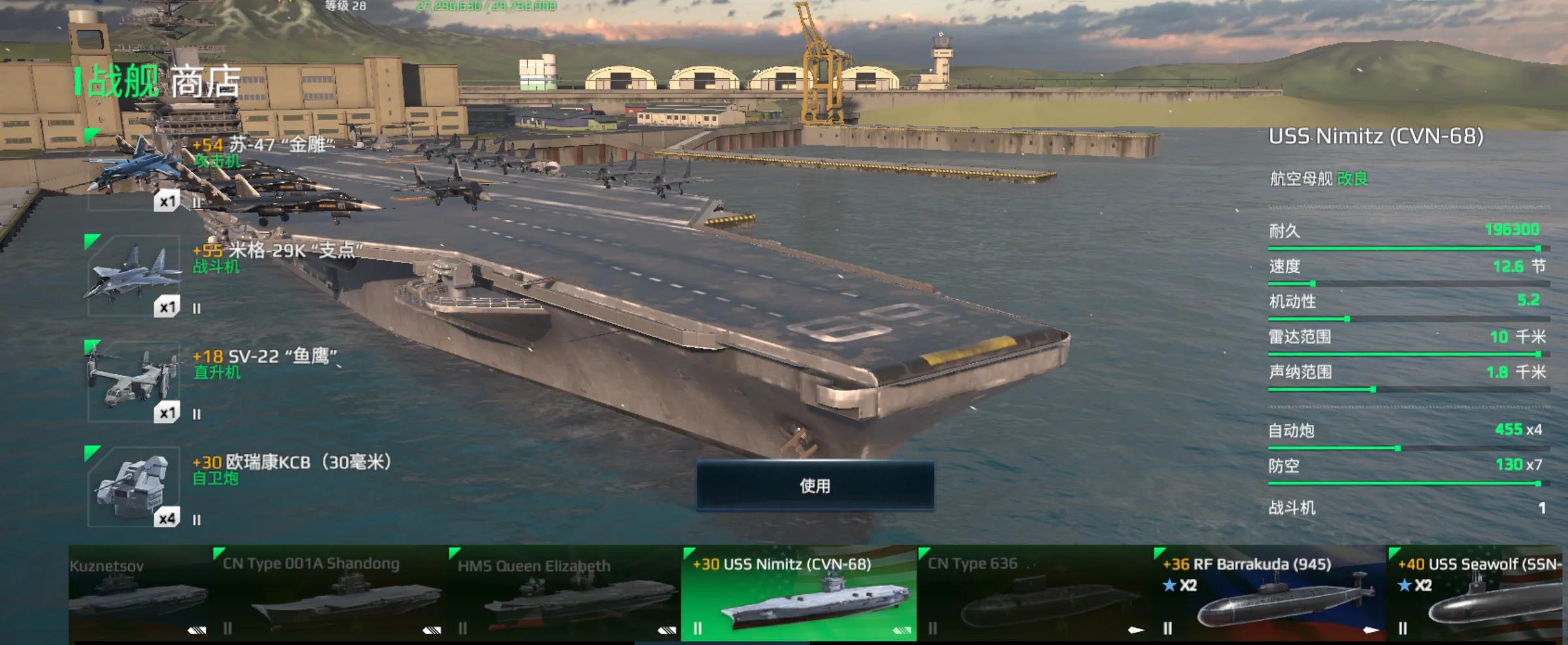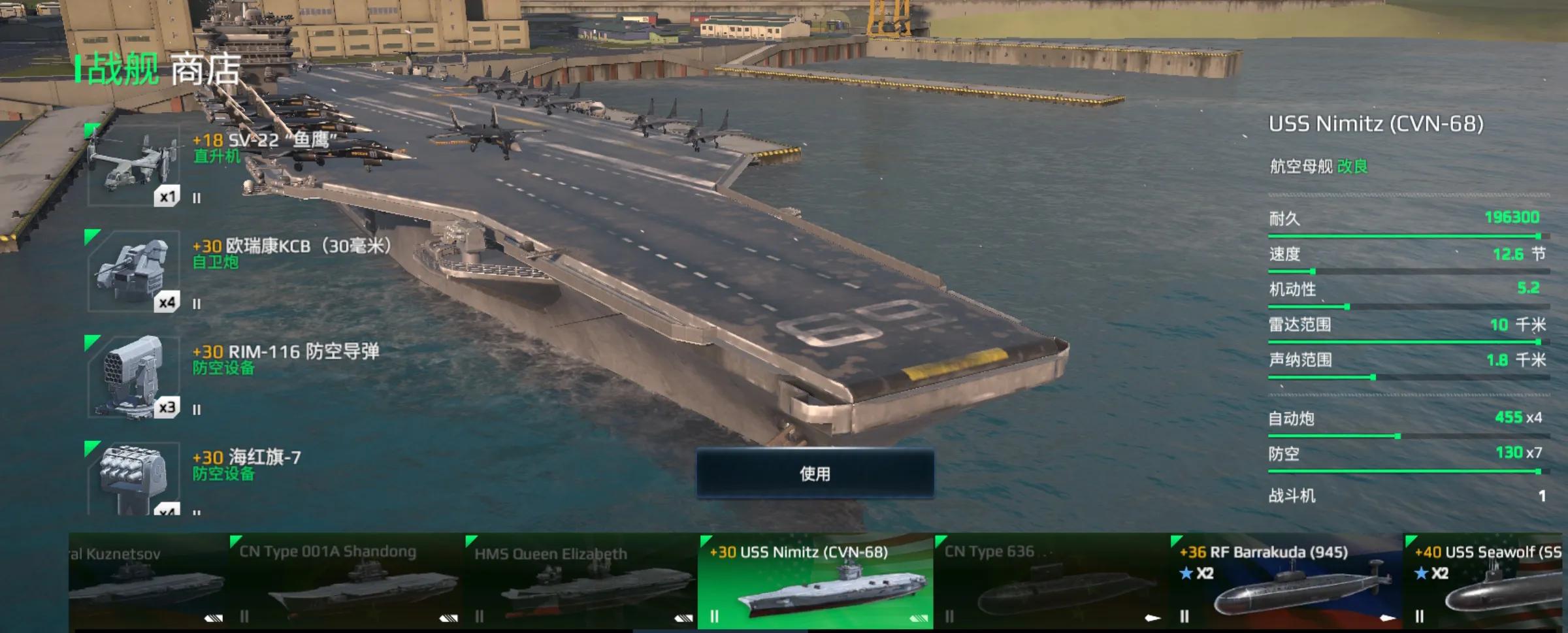 三:想玩航母的建议买尼米兹号,二级有自卫炮,对面来船突脸有自保能力,战斗机没有金雕建议歼15“飞鲨”或者俄罗斯那个攻击机,雄猫不太行,拦截机主要用来第一时间飞出去拿视野给队友,随便一台没影响,自卫炮要选爆发高的速射机枪“欧瑞康”其他类型爆发不高保护不了航母,直升机必须拿“鱼鹰”他的机枪准度是最高的,防空能打下一辆脆皮的战斗机,三级船也建议装上