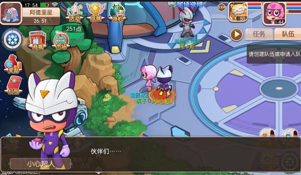 开局阶段,玩家会被随机选择分到古灵星、汪财星、刀疤星、喵美星、启源星、阿德里星六个星球,每个星球都会有一个标准的星球领袖,玩家需要完成星球领袖派给你指派的特定任务。这样设计会让每一名玩家都成为像开心超人一样守卫星球和平的小超人!
