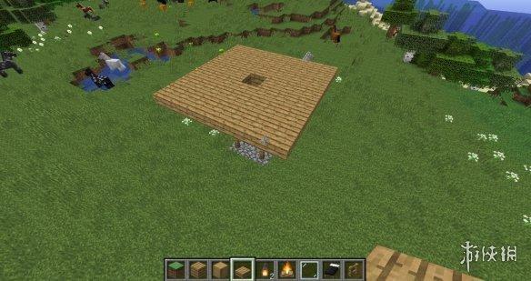 1.我们先打一个地基,用3x3的圆石铺好,四角分别往上垒四格栅栏栏杆。再放置3x3橡木木板,中间留空。