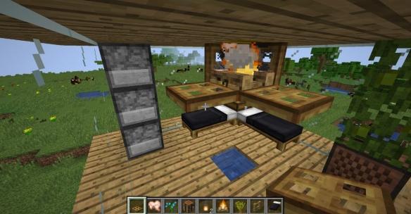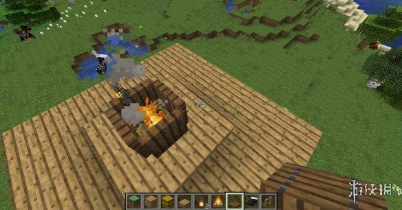 2.在顶部干草块下面放上篝火,然后用活板门围起来。这样放置的话之后打开活板门就可以烤肉了!
