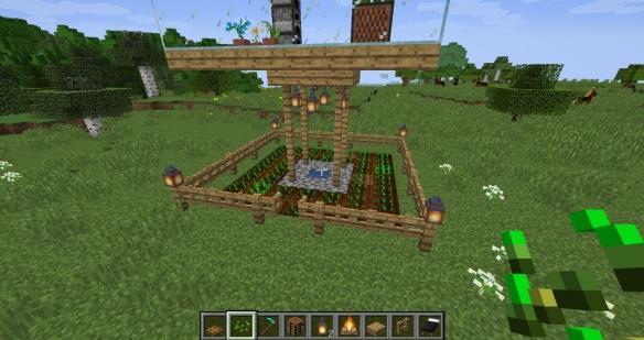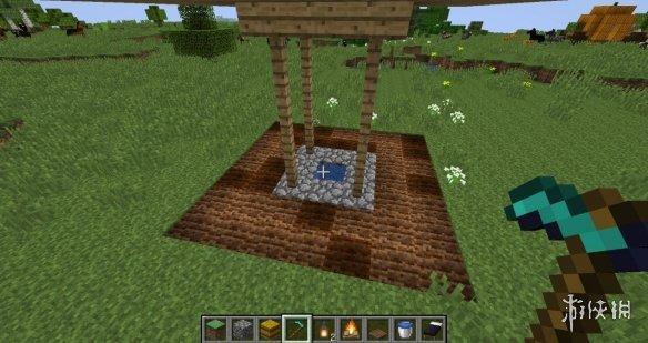 1.回到下面,圆石正中间挖开,水桶往中间补上水。用镐在周围打两圈耕地。