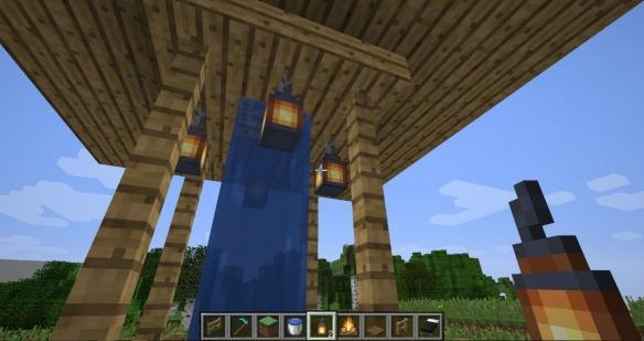 3.水桶对准底部缺口灌一次水,然后水柱四周加上灯,通过水柱上到小屋内,在缺口处放上任意活板门,水电梯就做好了。