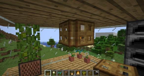 5.中间位置补上橡木木板和干草块。干草块上放上篝火,四周围上云杉木活板门,小屋顶部就做好啦!