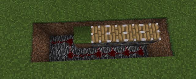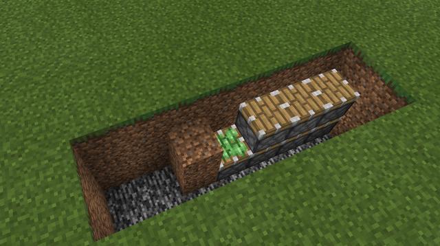 首先,我们需要挖一个三格深的长坑,然后底下放粘性活塞,上面放普通活塞: