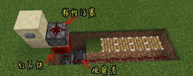 旁边则放上粘性活塞和红石块,左边放上按钮,用以激活整个装置(如下图摆放):