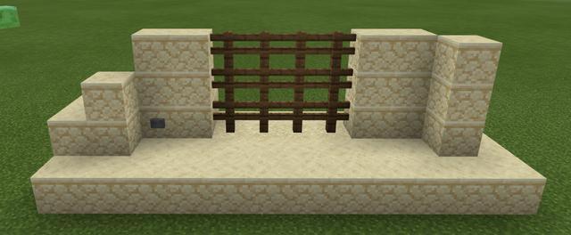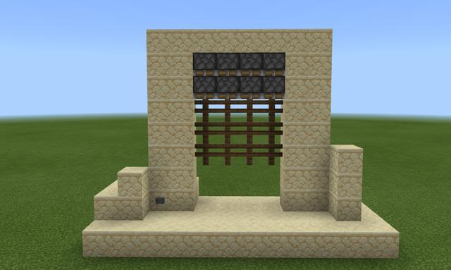 而在栅栏被顶起来的高度上,上方放上两个向下的普通活塞,然后再修饰一下,一个大门的样子差不多完成了: