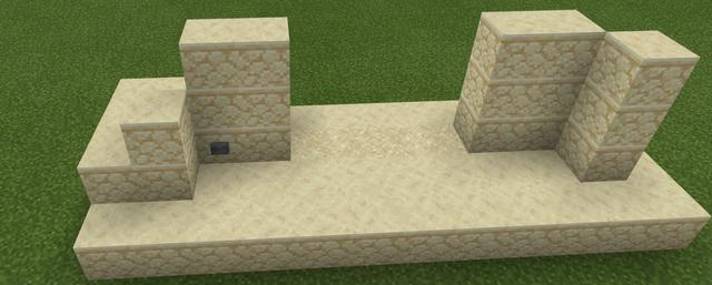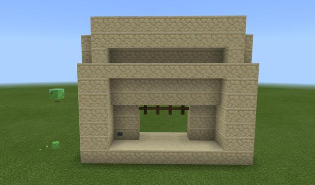 接下来,在活塞上面摆两层沙子,周围再稍微装饰一下,把红石线路隐去,这就是我们的大门基座了: