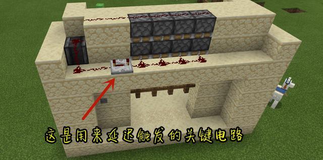 值得注意的是,下排的活塞要用到红石中继器,打满三格,用来延迟触发。
