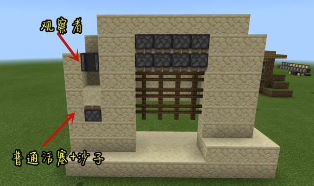 按下按钮触发活塞,沙子被顶起,触发上方的观察者,然后观察者旁边的电路就会被激发,让门头顶的活塞被放下,栅栏门归位。