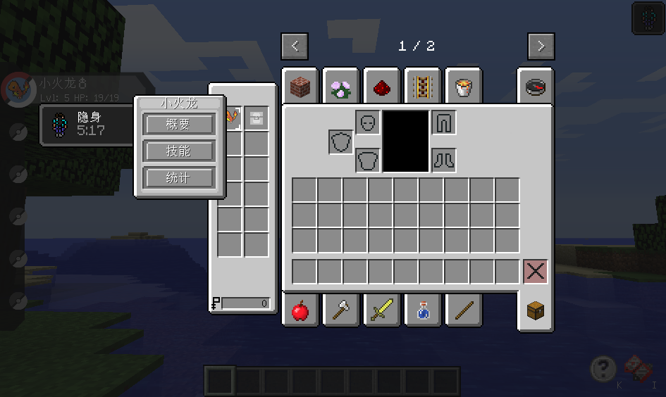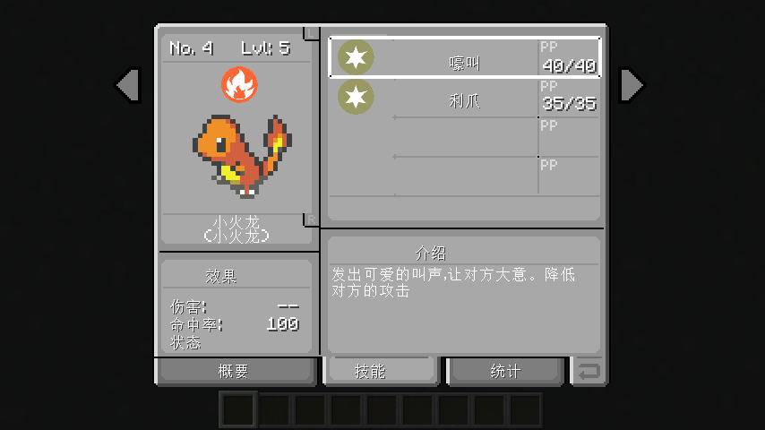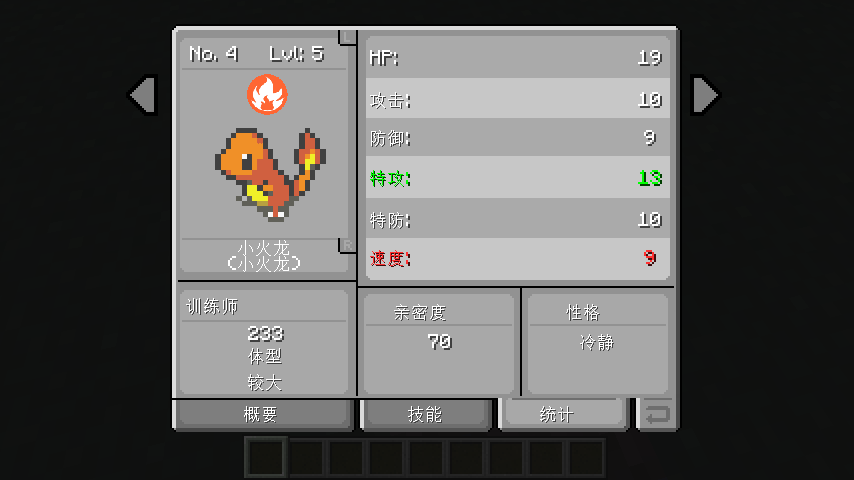 或者你也可以按‘E’键打开物品栏,你便可以看到左边的神奇宝贝对着任意一只神奇宝贝右键点击‘概要/技能/统计’3个任选一个即可.(可以看到‘神奇宝贝’旁边还有一个像‘包裹’一样的格子;用于放置道具.而‘神奇宝贝’最下方的有个类似钱的图标的为‘金钱’通过击杀训练师或者神奇宝贝神奇宝贝