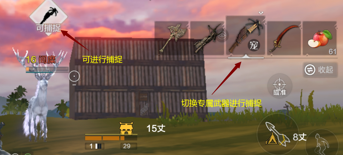 使用武器攻击野外怪物,击杀可搜寻怪物身上资源,例如兽肉一类···捕捉宠物,将怪物攻击至血量剩余一丝,即可开启捕捉,使用专用的捕捉宠物武器,开启捕捉。