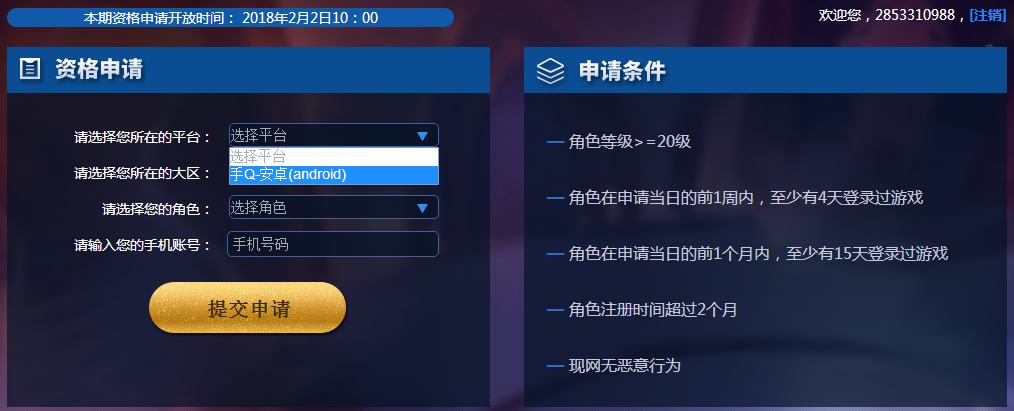 查看申请条件,选择平台(目前仅支持安卓)与角色提交申请即可,然后确认自己选择一个阵营参与抢号。