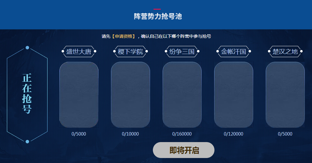 6. 号码池一共包含:盛世大唐,稷下学院,纷争三国,金帐汗国,楚汉之地5个阵营,每个阵营所开放的抢号数量并不一致,期望大家在体验服能为您的阵营赢得一席之地。