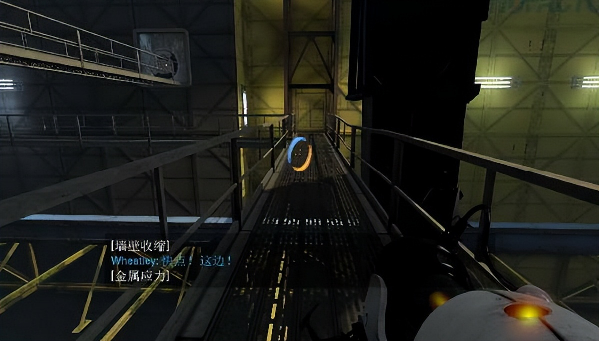 然后在斜对方的墙壁上开传送门,拾取箱子后,跳进底下的黄色传送门,依靠速度来到对面的台子上,把箱子放到红色按钮上。 接着站到大门的台子下面,对着墙壁开传送门,去跳进底下的黄色传送门,这样就可以到达目的地了。 坐电梯来到下一个区域再次遇到Wheatley。在它所在的房间的天花板上开传送门,利用边上的黄色传送门过去。过去后等待Wheatley废话完毕后,按E键拾取Wheatley,然后继续前进。