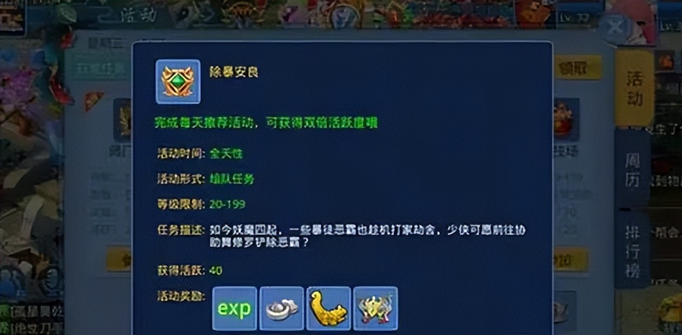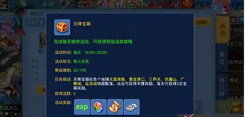 在每天的正午和黄昏时分,野外会有一个宝箱,可以通过点击宝箱来获取经验值,但是这种奖励是有限制的,必须是30级以上的玩家才能参加。