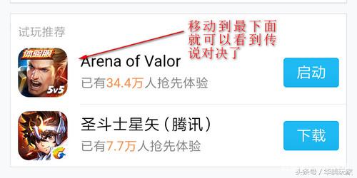然后滑动内容到最下方,就可以看到目前开放体验的新游戏了,看到了Arena of Valor,这个就是传说对决了,下载安装即可。