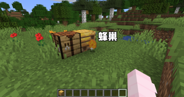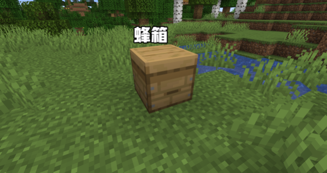 首先,我们看到了蜂箱,这个蜂箱就是我们的一个非常有趣的物品了,另外一点就是,我们的这个蜂箱虽然是出来了,但是效果确与蜂巢是一样的,而蜂巢的采集确实非常的简单,使用带有精准效果的工具就能够给它采集下来了,而且会连带里面的蜜蜂一起采集下来。