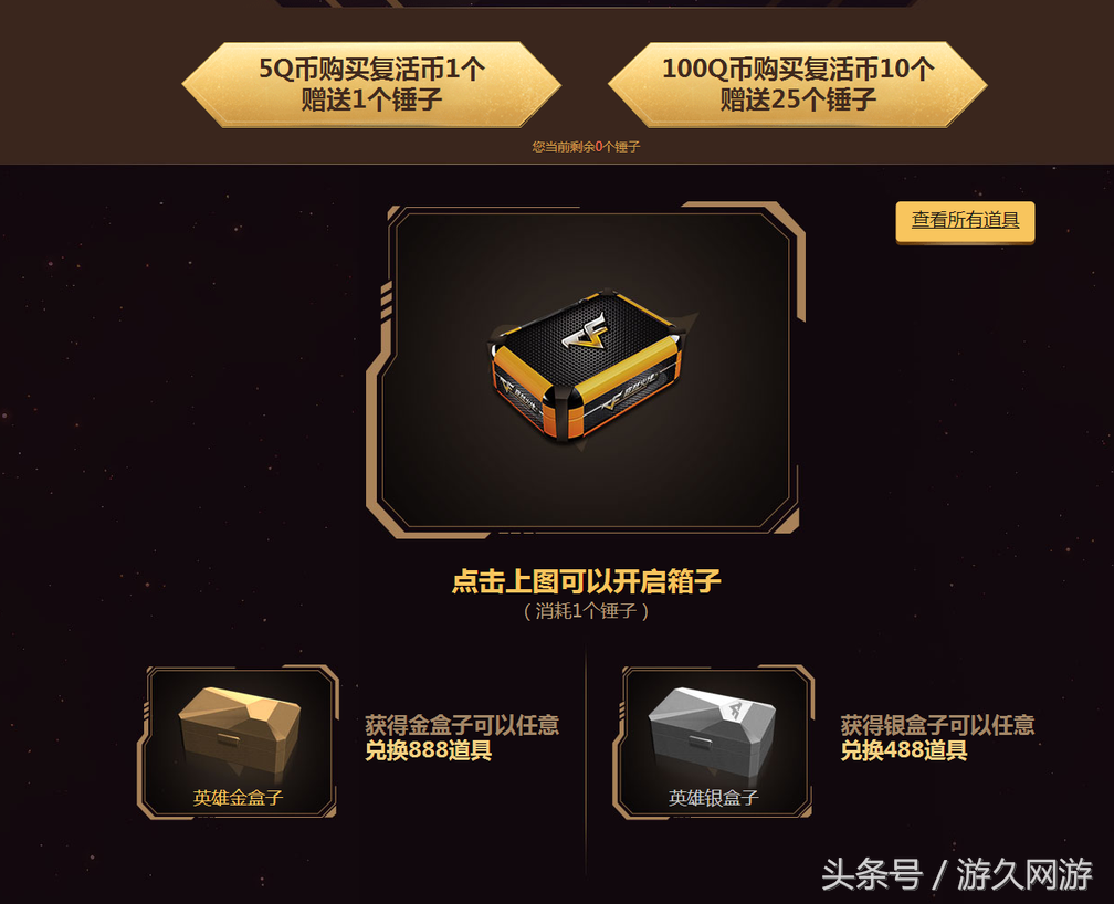 游戏规则非常简单粗暴,5QB买1个锤子,100QB25个锤子,直接开箱,出来什么就是什么。金盒子可以换一把888,银盒子换一把488