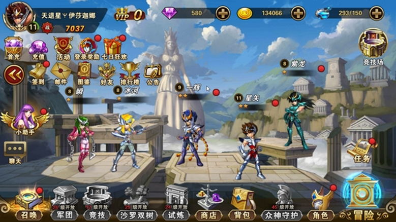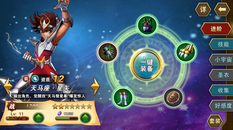 游戏基本上可看作是圣斗士版的《刀塔传奇》,玩法上如出一辙,还整合了一些市面的常见玩法,给人非常齐整的感觉。具体的不再多说,谈谈游戏一些优化,首先是各种一键功能的强化,换装、进化、升星等通通一键搞定,背包都不用打开,充分无脑化。另外还有小助手功能,显示当前可进行的操作,基本上是手把手在引导玩家了。教学任务的话比较简单,但是龙套关卡似乎有点长,战斗时间还不短。好在即使是新关卡,也是可以自动战斗的。另外,战斗失败会有惩戒:普通副本和精英副本挑战失败会扣1点体力。