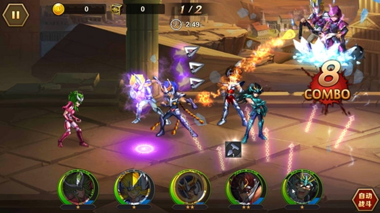 游戏采用横屏,主界面即可展现当前动态的5人队伍,背景是树立雅典娜雕像的卫城,潺潺溪水流过,关卡界面的云雾、光影细节也十分不错。战斗过程是2D的画面,各路招式秉承了国产手游的一贯传统,配合各种剧情动画,不求最炫,只求闪瞎你的狗眼。因为是非原创人物,普攻的表现不是很丰富,例如五小强组合,瞬可劲了丢链子,冰河拼命发龟派气功,星矢和紫龙抡起拳头一顿胖揍,有点小混混打群架的感觉。
