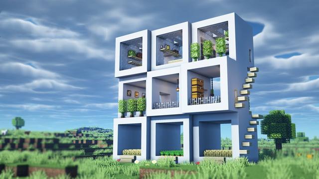 灵感飙升的一款建筑设计,非常单机生存的玩家使用,采用了九宫格的设计,让9个火柴盒搭在一起,利用错位来增加“层次感”,每一格的空间都可以用来实现独立的功能,比如下面三层是农作物区,中间则是仓库区,顶层距离地面相对较远比较安全,可以用来生存!