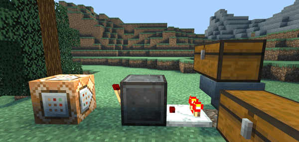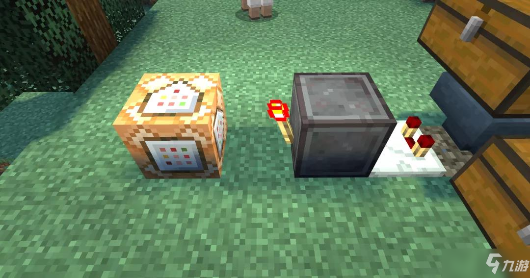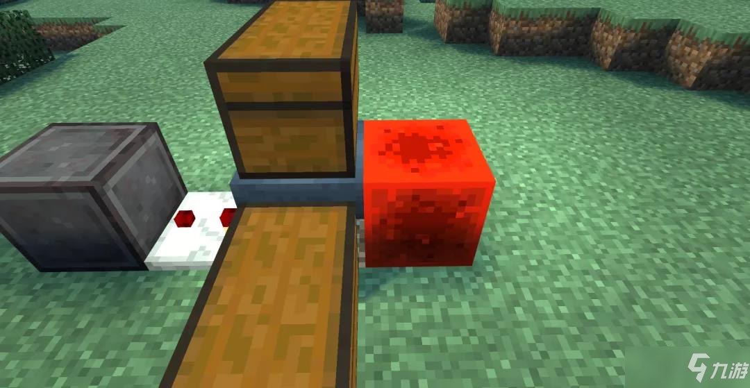在普通方块的左侧,放置一个红石火把和命令方块。