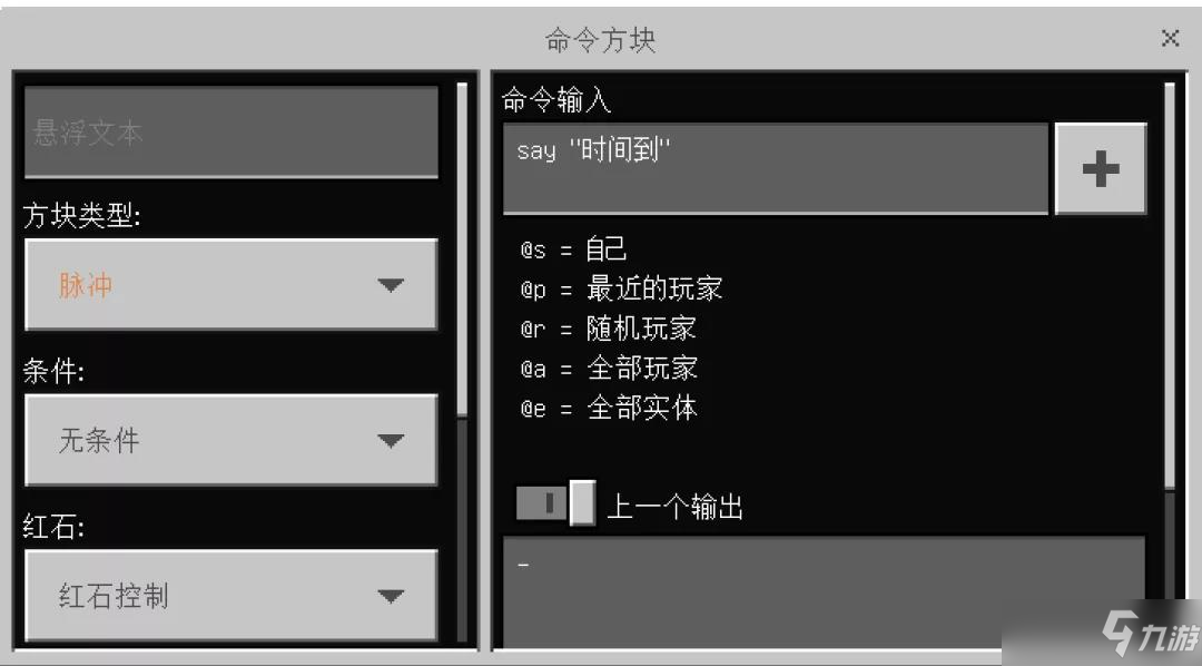 命令方块中输入(say "时间到"),用来提示我们计时完毕。