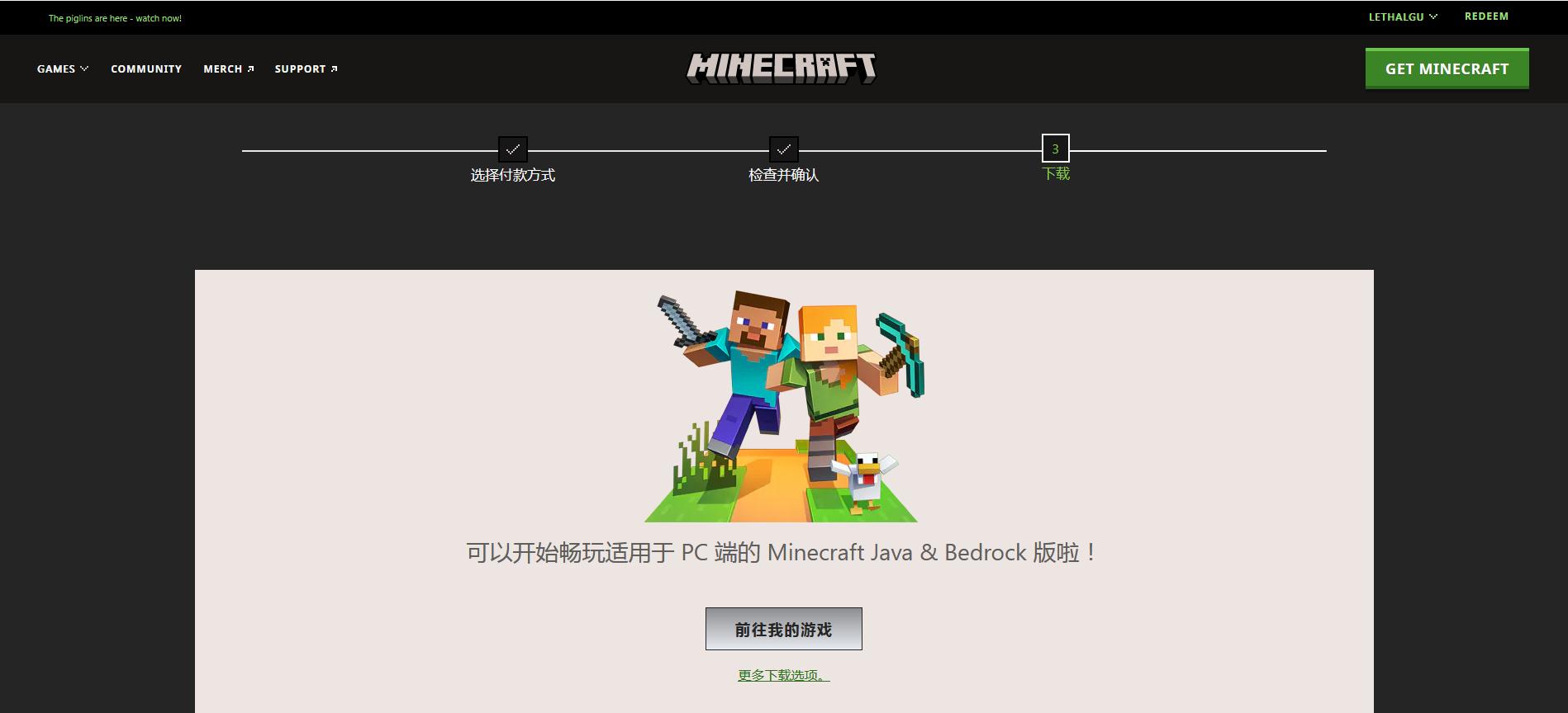 其实按照付款引导,最后一步就是下载项,但是如果玩家不小心退出了网页也没有关系,可以再次进入游戏官网,点击购买Minecraft,这时候就会弹出再次下载的选项,点击即可重新下载。