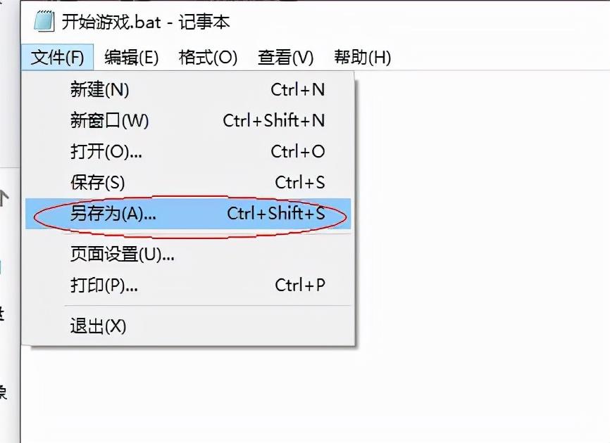 然后点击文件,选择另存为,名称改成(开始游戏.bat),保存在当前游戏目录下.