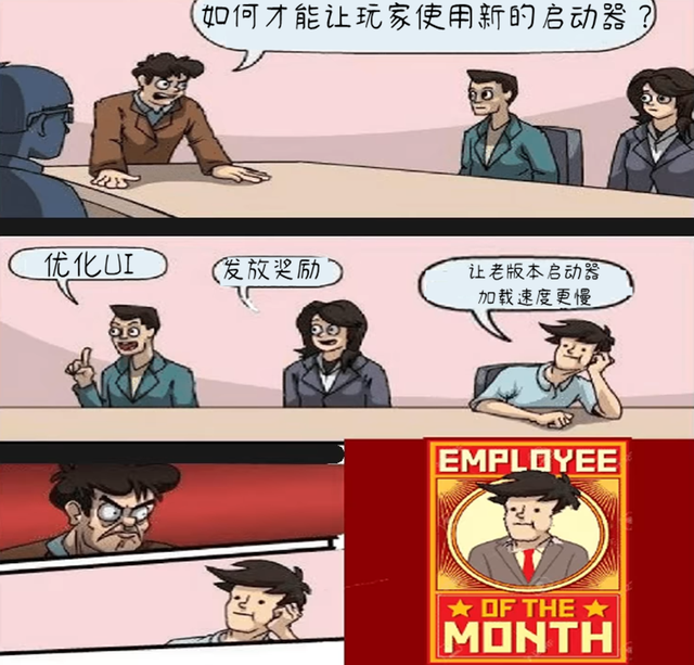 Minecraft的策划主管与策划们,商讨如何才能让玩家接受新的“启动器”,策划们纷纷出谋划策,“优化UI”、“发放奖励”均被PASS掉了,而此时一位员工,不急不慢地道出“老的启动器增加启动时间即可”,于是他便获得了下个月的“优秀员工表彰”。