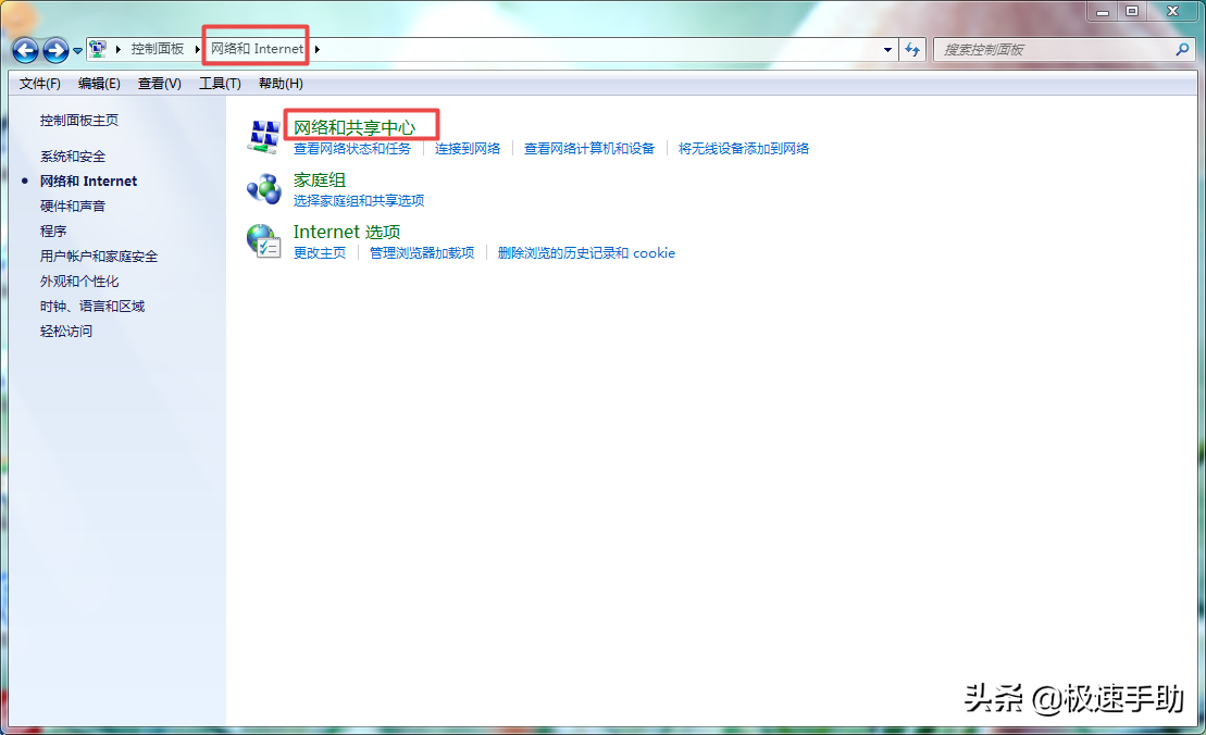 ①在电脑的控制面板中,我们找到【网络和Internet】选项,并点击进入。接着再点击【网络和共享中心】选项,点击打开。