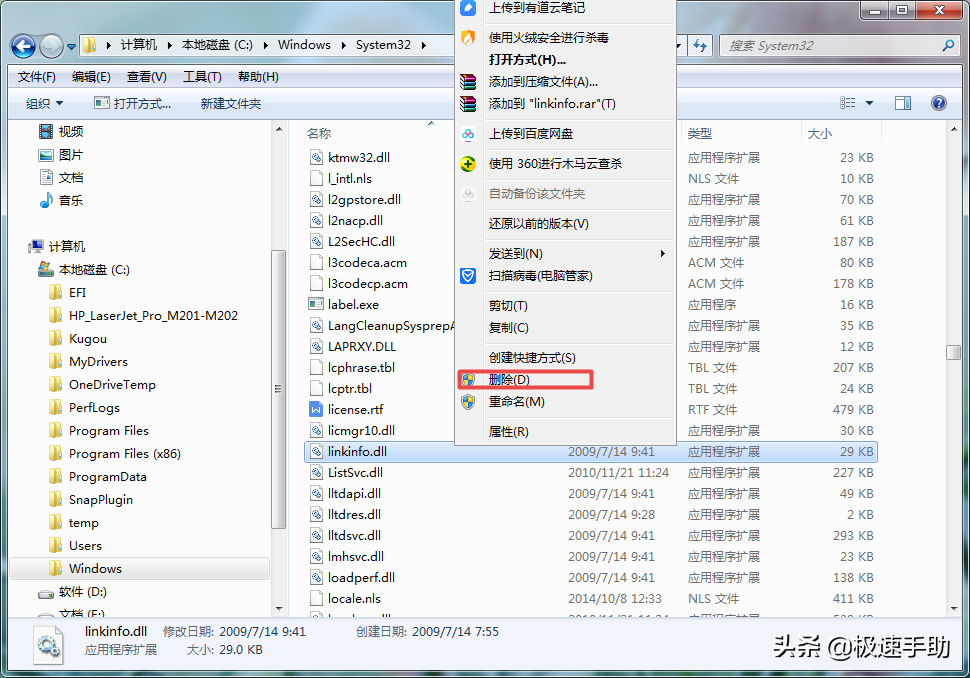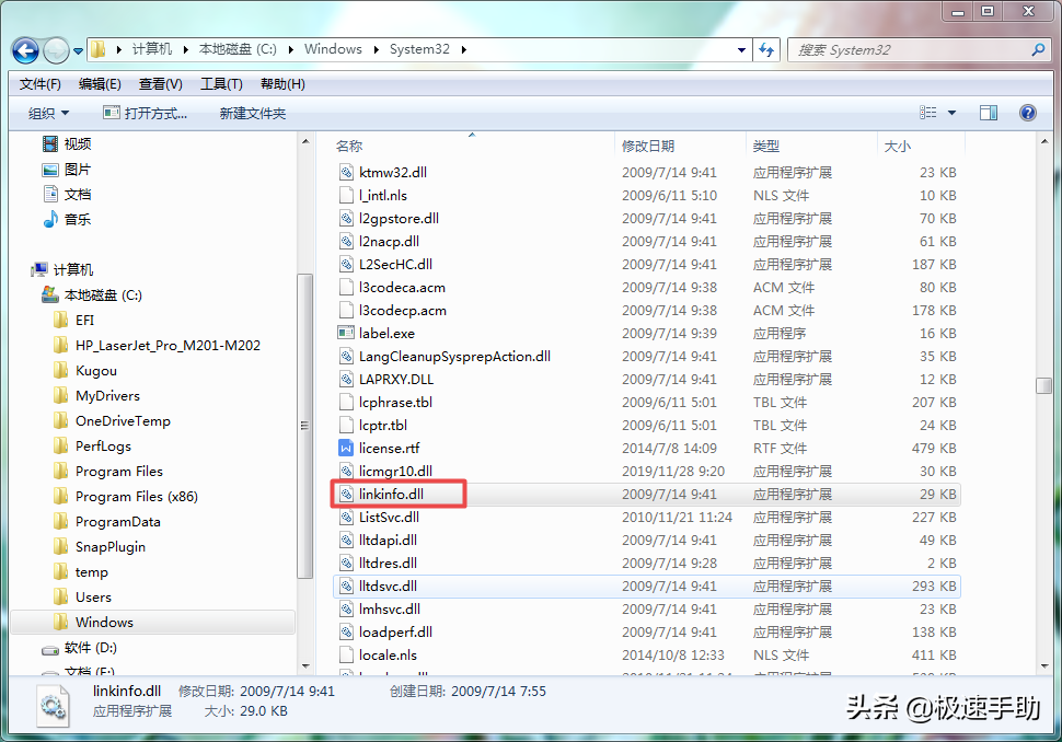 ②随后我们进入到【C:windows/system32】此路径当中去,然后再找到【linkinfo.dll】文件。