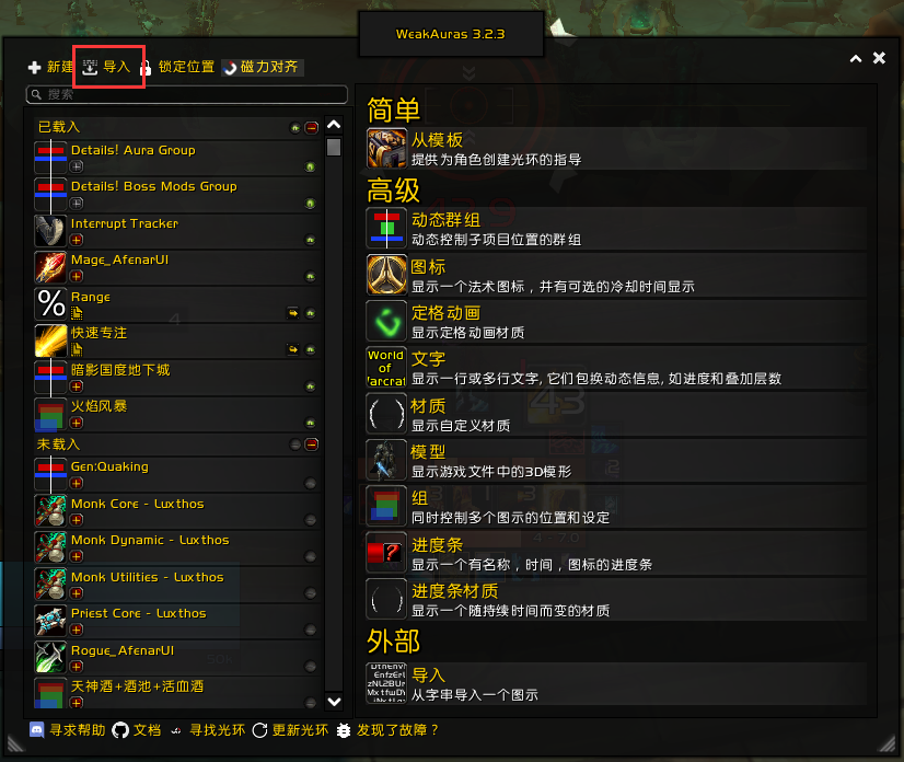 WA全称“WeakAura”,是一款功能强大的自定义光环条监控插件。在诸如“桃乐豆”、“魔兽大脚”等各大插件整合平台上就可搜索下载。将插件放入游戏根目录下的“AddOns”文件夹之后,在聊天框内输入“/wa”即可打开设置界面,调整多种多样的自定义配置。自己从零开始“组装”WA光环条需要大量操作,但初次尝试的萌新玩家也不用担心:WA插件自带“导入”功能,可以直接一键复制老手玩家已经设置好的界面样式。