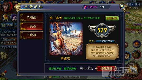 3V3模式在每周的周四开启,同样是有30次的挑战机会,比试地点在铜雀塔。玩家们可以自由组队之后进行匹配,也可单人进行匹配。当然是建议组队PK啦,这样对战术的安排大有帮助。