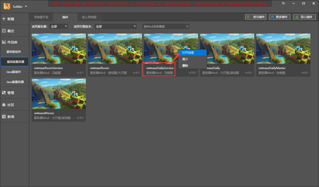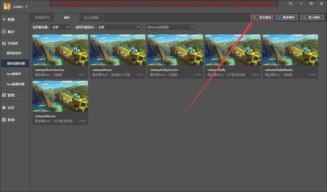 打开《我的世界》开发工作台,在左侧的【作品库】里选中【基岩版服务器】,【插件】标签页的右上角就设有【官方插件】和【更多插件】两个下载入口。